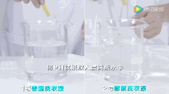 再用PH试纸测试一下,添加酵素洗衣液的2号杯中的试纸颜色无明显变化,果然是亲肤无残留~
